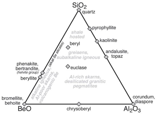 Beryllium is a minor constituent of the Earth’s crust with an average grade of 3 ppm Be. Due to their similarities in the ionic radii, Be can replace Si during igneous processes and, hence, it is more widely dispersed than accumulated in the main stage of magma differentiation. It is concentrated during the magmatic and metamorphic part of lithogenesis mainly in pegmatites, pegmatoids and meta-pegmatites and to a lesser extend in carbonatites (part a of Table 3) [15,16,17,18,19]. Beryllium minerals are very variegated with a marked predominance of Be silicates, over Be phosphates/arsenates, Be oxides/hydroxides, Be borates and Be antimonate arranged in order of decreasing abundance [20]. There is a dominance of beryllium-bearing gemstones within the older cratons, which have been disrupted by modern plate tectonics, such as the opening of the Atlantic Ocean conspicuously demonstrated by the Brazilian and Nigerian gemstone provinces on both sides of the Atlantic Ocean and the fragmentation of the eastern edge of Africa where Madagascar, Sri Lanka and India are top scorers of gemmy Be minerals. These deposits are lined up along deep-seated fault zones and of pegmatitic origin [21]. The largest beryllium accumulation of economic interest is located in the Spor Mountain District, USA [22,23]. The bertrandite and beryl mineralization is associated with Mn, F, U, Li, and REE concentrated in pipes and veins of a series of Eocene to Miocene volcanic and volcaniclastic rocks which are genetically associated with 21 Ma old, high-silica, topaz rhyolite. It is interpreted as an epithermal, stratiform, replacement deposit in porous basal pyroclastic sediments.