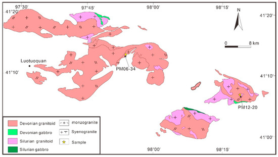 The SBOB is situated within the Hongliuhe and Liuyuan ophiolitic mélanges [10] (Figure 1b) and comprises the Shuangyingshan and Huaniushan Units. In addition, the southern Beishan has recorded the subduction and collision of several microcontinental fragments and is characterized by early Paleozoic volcanic–sedimentary formations and intrusive plutons generated during early Paleozoic subduction [20,22,36,37]. Recent geochronological studies in the region reveal three stages of pluton emplacement in the Mid-Ordovician to late Silurian [6,23,38,39,40], early Devonian [4,6,40,41,42], and Late Devonian to early Carboniferous [6,38].