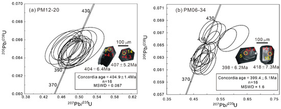 The zircons from monzogranite (PM12-20) and syenogranite (PM06-34) are similar in crystal morphology with sizes ranging from 80 to 200 μm and aspects ratios of 2:1–3:1. The CL images reveal oscillatory zoning and rare inherited cores (Figure 4). The Th/U ratios are >0.1, indicating magmatic origin (Table 1). Sixteen analyses from sample PM12-34 (monzogranite) were concordant and yielded a weighted mean age of 404.9 ± 1.4 Ma (Figure 4a). Sixteen spots were analyzed for dating from sample PM06-12, apart from six spots (RZ7, RZ9-11, RZ13, and RZ15), which represent the age of the inherited core, the remaining ten analyses yielded a weighted mean age of 399.4 ± 5.1 Ma (Figure 4b).