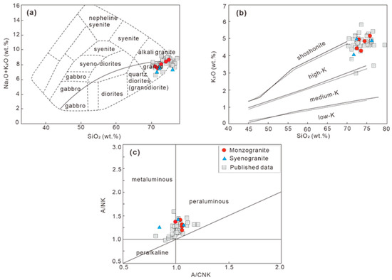 (a) Total alkalis (Na2O + K2O) vs. SiO2 diagram [49]; (b) K2O vs. SiO2 diagram [50]; (c) A/NK vs. A/CNK diagram [51]. Published data of the early Devonian granitoids in the Beishan area are from [4,6,30,31,42,52,53].
