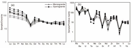 Chondrite-normalized REE element patterns (a) and primitive mantle-normalized trace element spider diagrams (b) for the Luotuoquan granites. Normalization values are from [54].