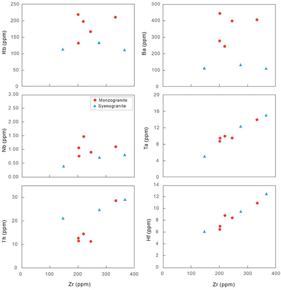The syenogranite samples in this study have undergone mylonitization, as evidenced by petrographic observation (Figure 2d). Therefore, it is imperative to evaluate the impact of alteration on both major and trace elements before discussing their petrogenesis [55]. Our samples demonstrate differentiated correlations between “immobile alteration” elements (e.g., Zr) and the other trace elements (Figure 7), where Nb, Ta, Th, and Hf display a stronger correlation with Zr than Rb and Ba, suggesting that this alteration has less effect on these elements. Consequently, the subsequent discussion will primarily focus on more immobile elements such as Nb, Ta, Zr, and REEs.