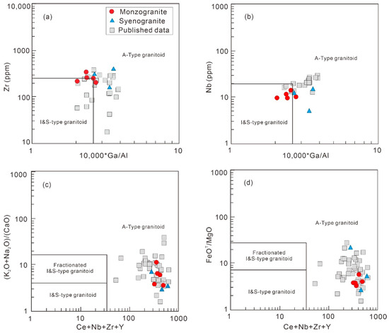 Discrimination diagrams for early Devonian granitoids from BOB. Zr (a) and Nb (b) vs. 10,000 ∗ Ga/Al and (K2O + Na2O)/CaO (c) and FeOT/MgO (d) vs. Ce + Nb + Zr + Y diagrams [57]. Published data are from the same references as in Figure 5.