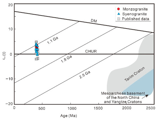 Zircon εHf(t) vs. Age (Ma) diagrams of granitoids from the SBOB (base map after [75]). Published data of granitoids from [6,42]. The data on Tarim, North China, and Yangtze blocks were from [78].