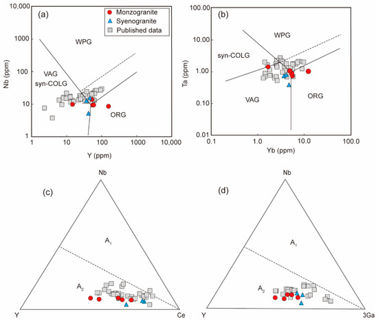 Nb vs. Y (a), Ta vs. Yb (b), Nb-Y-Ce (c), Nb-Y-3Ga (d) tectonic discriminant diagrams of the early Devonian granitoids from BOB ((a,b) modified after [56], (c,d) modified after [86]). Syn-COLG-syn-collision granites; VAG-volcanic arc granites; WPG-within plate granites; ORG-ocean ridge granites; post-COLG-post collision granites. Published data are from the same references as in Figure 5.