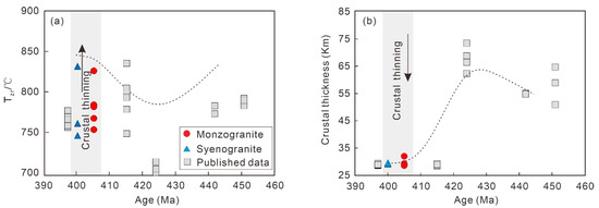 Tzr vs. Age (a) and Crustal thickness vs. Age (b) plots for Paleozoic granitoids in the SBOB. Published data from [4,6,42].