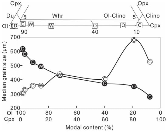 | Sample No. | Modal Content (%) | Opx Grain Size (μm) | Opx Grain Size Median (μm) | Opx M Index |