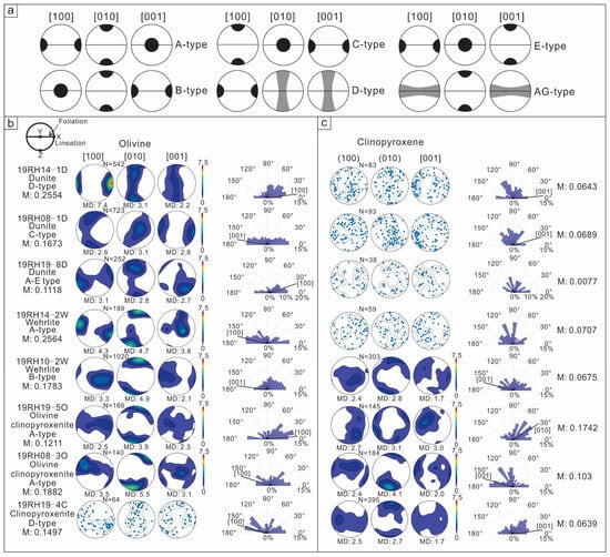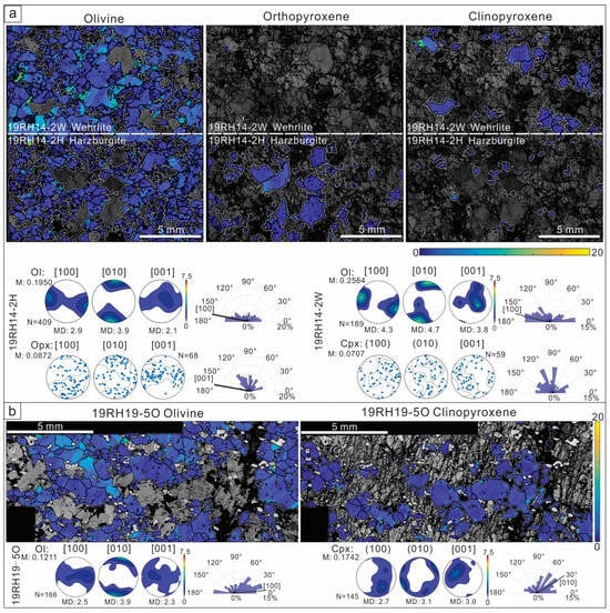 | Sample No. | Lithology | Ol (%) | Opx (%) | Cpx (%) | Sp (%) | Ol CPO Type | Ol Grain Size (μm) | Ol Grain Median (μm) | Ol M Index | BA Index | Cpx CPO | Cpx CPO Type | Cpx Grain Size (μm) | Cpx Grain Median (μm) | Cpx M Index | LS Index | Ol and Cpx Coherence a |