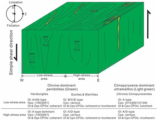 - Tommasi, A.; Tikoff, B.; Vauchez, A. Upper mantle tectonics: Three-dimensional deformation, olivine crystallographic fabrics and seismic properties. Earth Planet. Sci. Lett. 1999, 168, 173–186. [Google Scholar] [CrossRef]