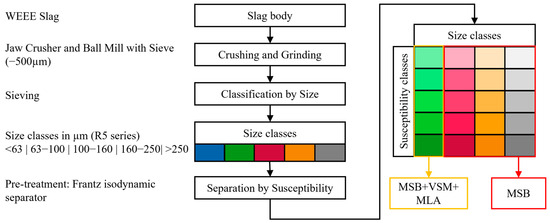 The workflow used to create a detailed particle dataset according to the presented characterization methodology is summarized in Figure 1. The methodology consisted of first milling the sample below a 500 µm size fraction, and then classifying the sample material into size classes and subsequently into magnetic susceptibility classes, except <63 µm size classes due to their poor flowability. After size classification, the magnetic susceptibility classes were generated using the Frantz isodynamic separator and their susceptibilities were directly measured with a magnetic susceptibility balance. This method enabled the distribution of phases from each size class based on their susceptibilities into different magnetic susceptibility classes. This, according to Equation (4), reduced the complexity of the phases in each magnetic susceptibility measurement of MSB. For the further characterization of the magnetic susceptibility classes with MLA and VSM, the most suitable size class was selected; more information about this is presented in Section 3.1.