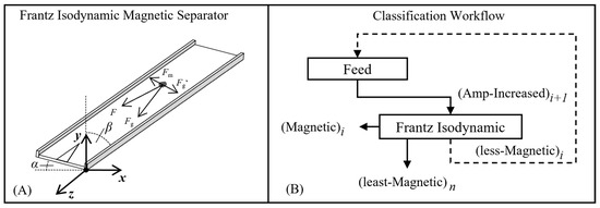 A Frantz isodynamic magnetic separator (self-made in former German Democratic Republic) was used to classify the distribution of particle magnetic susceptibility within each particle size fraction [28]. In this separator, particles are separated purely according to their magnetic susceptibility, since the product of the magnetic field strength and field strength gradient is constant at every point in the separation space. Particles for which Fm is large enough to change their trajectory enter the magnetic product. The other less-magnetic particles under the influence of Fg do not change their trajectory and enter the non-magnetic product (Figure 2A). These products (magnetic classes) were generated at an increasing magnetic field strength, as shown in Figure 2B. The increase in the magnetic field strength was achieved by varying the separator current, with values of 0.50 A, 0.70 A, 0.85 A, 1.00 A, 1.15 A, 1.30 A, 1.45 A, and 1.60 A, in an increasing order. The feed material for each magnetic field strength is the insufficiently magnetized fraction of the previous separation round, at a slightly lower field strength. The above-mentioned procedure was used to generate the magnetic classes of the following size fractions: 63–100, 100–160, 160–250, and >250 µm.