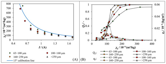 (A) Correlation of current used for separation and measured magnetic susceptibility of different size fractions from WEEE slag. (B) Respective magnetic susceptibility distributions of these size classes obtained according to measurements with a weight balance.