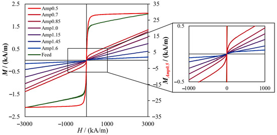 Magnetic hysteresis loop measurements of the magnetic susceptibility classes showing the presence of ferromagnetic phases in the material. Note that the 0.5 A sample shows much higher magnetization and is thus plotted on a secondary axis. The spectrum of colors from red to blue shows the decrease in the magnetization of the magnetic susceptibility classes from Amp 0.5 to Amp1.6.