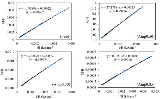 Along with the feed material, the magnetic susceptibility classes collected at 0.5, 0.7, and 0.85 A displayed ferromagnetic and paramagnetic characteristics in their M-H curve. To further analyze the ferromagnetic and paramagnetic components of these fractions, Honda–Owen plots were created (Figure 6). A linear relationship between the magnetic susceptibility and the reciprocal of the field strength can be observed in these Honda–Owens plots. The slope of this linear relation can be used to estimate the concentration of the ferromagnetic fraction, as described in Equation (6) in Section 2.3, by using the ferromagnetic saturation magnetization () value of 28.0 kA·m−1, obtained from the M-H curve of the magnetic susceptibility class collected at 0.5 A.