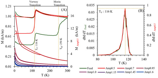 In Figure 7A, both the feed and Amp 0.5 samples show a noticeable step-like increase in their ZFC and FC curves at 116 K. The jumps observed in both the ZFC and FC curves within the temperature range of 100–120 K correspond to the Verwey transition (TV) in magnetite [35]. In Figure 7B, the derivative of the magnetization (M) and the temperature (T) from the feed and Amp 0.5 show a peak at 116 K, corresponding to the Verwey transition temperature of magnetite in this study. The Verwey transition represents a low-temperature phase transition in magnetite that induces changes in its magnetic, electrical, and thermal properties [36]. Typically, this transition is expected near 120 K, but can be observed within a range of 80 to 125 K [37]. As the temperature crosses the Verwey transition temperature, the crystal lattice of magnetite transforms, shifting from a monoclinic structure to a metallic cubic inverse spinel structure, which persists at room temperature [38]. Additionally, the ZFC curve of the feed sample displays an additional step increment at 250 K. This particular jump in the ZFC curve of the feed sample at 250 K can be attributed to the Morin transition (TM), which occurs within the hematite structure [39]. This transition signifies a shift in the spin structure from a antiferromagnetic (at lower temperatures) to a weak ferromagnetic state at room temperature [40]. The small increment in the ZFC curves at low temperatures (around 10 K) shows the traces of nanoparticles [40]. In the ZFC curve of Amp 0.7, a slight jump in the magnetization is visible around 140 K, which could be due to another phase going through the magnetic transition. The ZFC curve at Amp 0.85 did not show a magnetic transition jump; this is due to the low amount of ferromagnetic material in the sample.