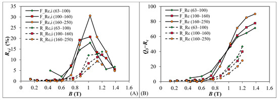 The recovery of magnetic susceptibility classes using the Frantz isodynamic and ring-type separators at different flux densities is presented in Figure 10. The recoveries obtained using the ring-type separator are relatively lower than those obtained using the Frantz isodynamic separator. This discrepancy can be attributed to the distinct particle separation mechanisms employed by each separator.