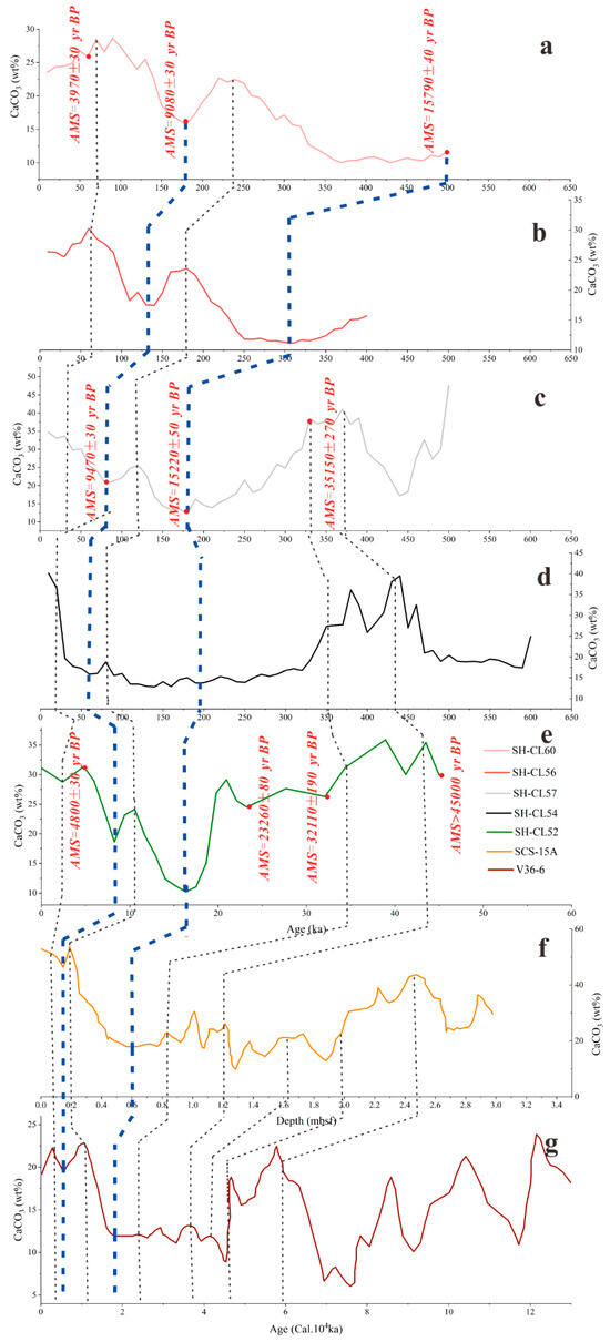 Chronological frameworks of the cores: (a–d). Displayed are the carbonate content profiles of Cores CL60, CL56, CL57, and CL54, respectively. (e). The green line represents the carbonate content profile of Core SH-CL52, a core that features ASM14C dating and paleomagnetic data within the Shenhu area [8]. This core serves as the primary reference for establishing the chronological frameworks of our study sites. (f,g). The carbonate content profiles of SCS-15A and V36-6 are considered standard curves for carbonate content within the South China Sea [56].