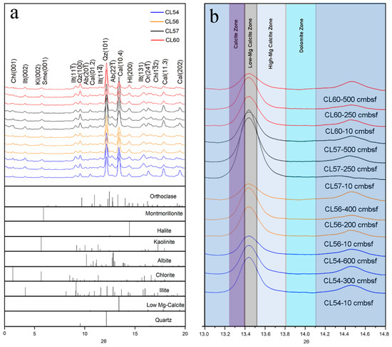 XRD patterns of sediments from different depths (at 10–20 cmbsf, 250–260 cmbsf, and 490–500 cmbsf, respectively) of the four cores are presented (Figure 5). The identified minerals include quartz, low-Mg-calcite, halite, illite, albite, orthoclase, kaolinite, chlorite, and montmorillonite (Figure 5a). XRD patterns of sediment from the four sites exhibit similarity. Peaks (104) of carbonates are magnified in Figure 5b, with low-Mg-calcite dominating the carbonate species (Figure 5b).