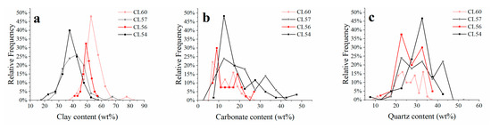 Frequency distribution graph of different minerals in the cores. Core CL56 and core CL60 have higher clay content than core CL54 and CL57. (a). Frequency distribution graph of clay for four cores. (b). Frequency distribution graph of carbonate for four cores. (c). Frequency distribution graph of quartz for four cores.