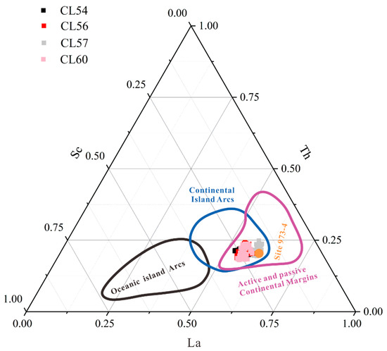 The mineral contents of the four cores are depicted in Figure 5 and Figure 6. The clay content exhibits a wide range, spanning from 20.3 to 78.1 wt%, with an average of 45.3 wt% (n = 200). Carbonate content varies between 5.49 and 47.4 wt%, with an average of 16.6 wt% (n = 200). Quartz content falls within the range of 8.96 to 44.9 wt%, with an average of 28.9 wt% (n = 200). Vertically, clay content remains relatively stable, while quartz and carbonate exhibit opposite trends. Frequency distribution graphs of mineral contents are presented in Figure 6. The clay content frequency distribution across the four cores displays a normal distribution (n = 200). Cores CL56 and CL60 exhibit higher clay content than cores CL54 and CL57 (Figure 6a). The frequency distribution of carbonate content in the four cores shows a left-leaning trend (n = 200) (Figure 6b), whereas the quartz content frequency distribution displays a right-leaning trend (n = 200) (Figure 6c). To distinguish the provenance of the sampled sediment, this study utilized the La-Sc-Th triangular diagram (Figure 7). The La-Sc-Th triangular diagrams of sediment from all four cores (n = 200) exhibit a high degree of similarity.