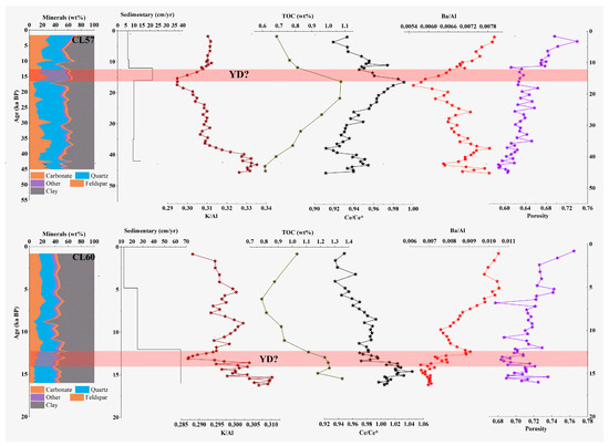 Minerals contents and sedimentation rates, K/Al (weathering index), TOC content, Ce/Ce* (redox index), Ba/Al (productivity indicator), and Porosity variations for CL57 and CL60.