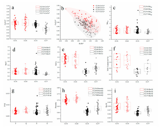 Comparison of productivity, porosity, reduction condition, sedimentation rates, and TOC contents in different SMI depth sites. (a). Box plot of Ce/Ce* for the cores (n = 200). (b). Scatter plot of Ce/Ce* vs. Pr/Pr* for the cores (n = 200). (c). Box plot of MoEF for the cores (n = 200). (d). Box plot of Mo/U for the cores (n = 200). (e). Box plot of Ni/Co for the cores (n = 200). (f). Box plot of TOC content for the cores (n = 58). (g). Box plot of P/Al for the cores (n = 200). (h). Box plot of porosity for the cores (n = 200). (i). Box plot of Ba/Al for the cores (n = 200).