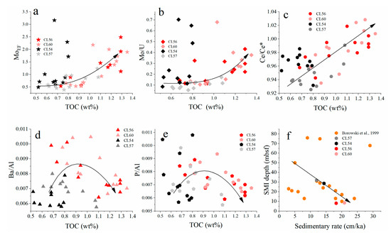 The TOC content in sediments is influenced and regulated by a multitude of sedimentary factors, including sedimentation rate, marine productivity levels, redox conditions, and more [39]. In different regions, the sedimentary factors that control the TOC content may also vary greatly [5,40,41]. For example, some studies suggest that the higher the productivity level in marine sediments, the higher the TOC content [42], but some studies have found that the TOC content sometimes shows an opposite trend to marine productivity indicators [16,43]. The sedimentary condition is not unidirectional for regulating the TOC content. For example, as the sedimentation rate increases within a certain range, the organic matter content will increase, but too high a sedimentation rate will dilute the organic matter content [44]. Therefore, controlling the TOC content in a region is the result of multiple sedimentary factors acting together, and it has a certain regional specificity. The main controlling factors affecting the TOC in sediments may be completely different in different regions.