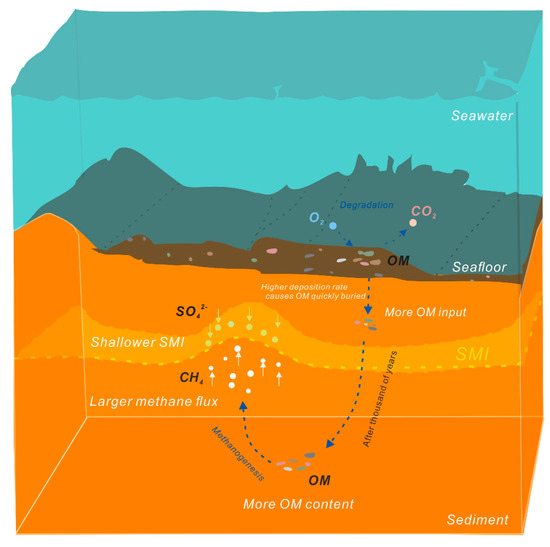 In general, organic matter sulfate reduction (OSR) is commonly recognized as the primary pathway for sulfate depletion, with organic matter content playing a pivotal role in controlling sulfate concentration and the depth of the SMI in marine sediment [5,67]. However, within gas hydrate burial regions, methane anaerobic oxidation (AOM) emerges as the predominant reaction, leading to a more rapid consumption of sulfate compared to OSR [4,5,33]. In these gas hydrate burial regions, the rate of AOM and sulfate flux is primarily controlled by methane flux [4]. Methane flux also governs the depth of the SMI in gas hydrate-buried regions [4].