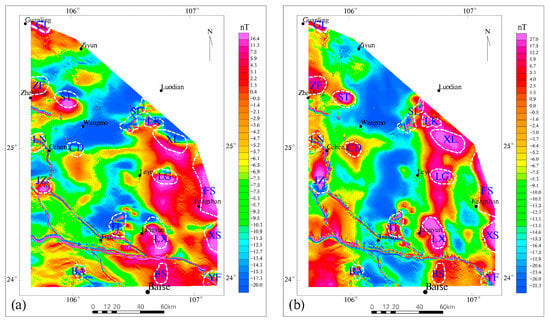 In Figure 6a, it is evident that the magnetic anomalies in the eastern part of the study area are significantly higher than those in the western part, indicating a shallower magnetic basement in the east. There is a Fault F5, which trends approximately north-south and divides the study area into eastern and western blocks. Figure 7a illustrates that Fault F5 is segmented into southern and northern segments by the later northeastward Fault F8. The existence of Fault F8 is also supported by evidence from Figure 2. Furthermore, it is important to note that linear anomalies with high intensity and steep gradients are observed throughout the entire study area, spanning from southeast to northwest. These anomalies are particularly prominent in areas such as the Yufeng−Tianlin−Ceheng area, the Longchuan−Ding’an area, and the Yangxu−Pingshu area. These anomalies are attributed to the presence of artificial high-voltage DC power lines. The magnetic field characteristics mentioned above are comprehensive reflections of various structures, magmatic activities, strata, and lithologic distributions, forming the basis for litho-structural mapping.