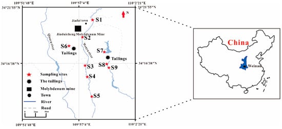 Therefore, we collected the water and sediments following the molybdenite migration direction at the Jinduicheng molybdenite mining area in Shaanxi Province, China (Figure 1). The objectives of this study include: (1) to clarify the distribution characteristics of Mo and U in the water and sediments near the molybdenite mining; and (2) to discuss the source and migration of these toxic elements in the water and sediments downstream of the mining area.