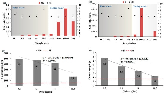 The spatial analysis of sediments revealed that with an increase in distance, the content of U and Mo gradually decreased (Figure 3c,d); R2 was 0.6605 and 0.9897, respectively. To predict the downward trend of Mo and U content in river sediments and the spatial impact range of molybdenite downstream, a linear regression equation was used to fit the data. It was calculated that the Mo content at about 21.5 km downstream of the Wenyu River was lower than the background value S1, while the U content was lower than the background value at 12 km; thus, the theoretical range of the polluted environment in the mining area was 21.5 km (Mo) and 12 km (U), respectively.