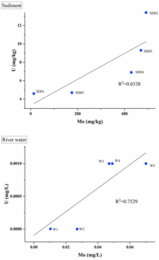 To gain a deeper understanding of the downstream migration of U and Mo, a linear correlation analysis was conducted on the Mo and U concentrations in the river water and sediments downstream of the mining area. The results show that the correlation coefficient is R2 = 0.6538 (sediments) and R2 = 0.7529 (river water), indicating that U and Mo in sediments and water had similar sources, especially natural mineral weathering (Figure 5). The results were consistent with the findings of Kayzar et al. (2014) [,]. On this basis, it is suggested that the high content of U downstream of the mining area may be the result of U enrichment in molybdenite.