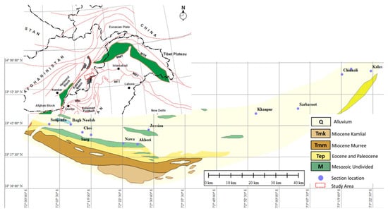Attock Hazara Fold and Thrust Belt (AHFTB), which is itself part of the Northwest Lesser Himalayas, presents a narrow EW trending strip comprised of thick sedimentary package with low grade metamorphic rocks along the hanging wall of the Nathiagali Thrust (NGT) in Northern Pakistan []. Geologically, it is surrounded by the Panjal/Kherabad Fault in the north and bordered by the Main Boundary Fault (MBT) in the south (Figure 1) [,,,].