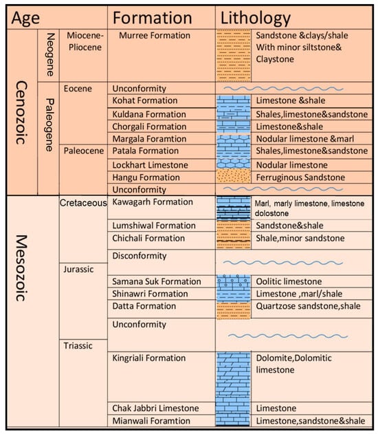 Northern Pakistan is comprised of three convergence tectonic elements: the Indian Plate, the Kohistan-Ladakh Arc (KLA), and the Asian Plate from south to north [,,,,,,]. This collision led to the development of the Himalaya Mountain range along the northern margin of the Indian Plate. The movement of the Indian Plate northwards caused older rocks to be thrust over younger strata, resulting in the formation of small fault-bounded blocks including the Trans Himalaya, Higher Himalaya, Lesser Himalaya, and Sub-Himalaya [,,]. In the western Himalayan Basin (HB), the Lesser Himalayas of Pakistan are bounded by the Hissartang Fault in the north and the Indus River in the west, constituting the southernmost extension of the Himalayas []. The sedimentary succession in the region, from Triassic to Miocene-Pliocene, is tightly folded and cut by numerous thrust faults []. The Jurassic sedimentation consists of the Datta Formation, Shinawari Formation, and Samana Suk Formation (Figure 2). The Cretaceous succession includes the Chichali Shale, Lumshiwal Formation, and Kawagarh Formation. The Chichali Shale contains belemnite and pyrite and was deposited in anoxic restricted environments when the Indian Plate was separating from Gondwana []. The Kawagarh Formation is mainly comprised of limestone and marl with subordinate dolomite [,,,,] that was deposited over a carbonate ramp formed due to the subsidence created by the northward drift of the Indian Plate [].