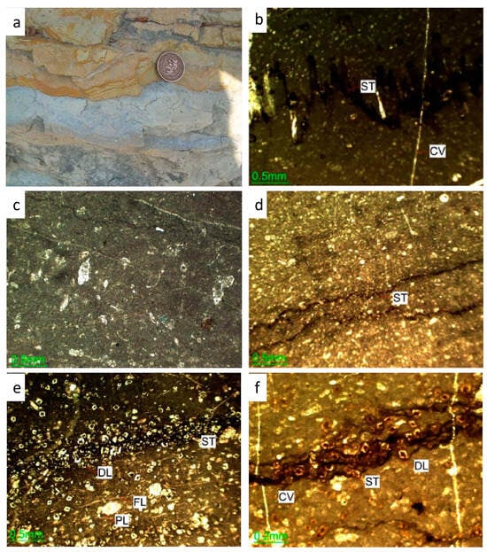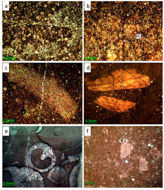 Neomorphism refers to transformations of mineral crystals caused by dissolution and reprecipitation in such a way that bulk chemistry remains intact [,,]. Neomorphism includes the various types of transformations occurring in carbonate sediments like replacement, inversion, and recrystallization. Neomorphism is prominent in Kawagarh where the skeletal particles are recrystallized into coarse calcite crystals and micritic lime mud groundmass and already developed microspar affected by neomorphism and generally show the replacement of finer crystals with coarsely crystalline calcite. In marl or mudstone facies, the microspar tiny patches occur indicating neomorphism of micrite or lime mud (Figure 3f), and similarly skeletal particles show less effects of neomorphism. In wackstone and packstone microfacies, micrite and skeletal grains are significantly altered by neomorphism (Figure 3c,d and Figure 4a,b). The skeletal particles of calcispheres and planktons are extensively replaced by coarse calcite (Figure 4a,b) in wackstone and packstone facies. Planktons (Figure 4b), trigonia, textularia (Figure 4f), echinoid (Figure 4c), and calcispheres (Figure 4a) are largely affected by neomorphism. However, filaments, oysters (Figure 4d), inoceramids (Figure 4f), and ostracods are less affected.