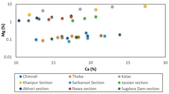 The major elements, calcium and magnesium, show covariance across the sections, with mean values of 20.6% and 18.8%, respectively, with Ca ranging from 14.8% in Nawa to 23.9% in Sojhanda, and Mg ranging from 14.0% in Jassian to 23.6% in Bagh Neelab. The Khanpur, Sojhanda, and Bagh Neelab sections exhibit higher Mg content in the upper parts of Kawagarh, whereas in Jassian the Mg contents are high from the basal to the middle parts, and in Kalas the basal and upper parts have higher Mg content. All other sections exhibit higher Mg occurrences only in the basal parts of Kawagarh (Figure 9).