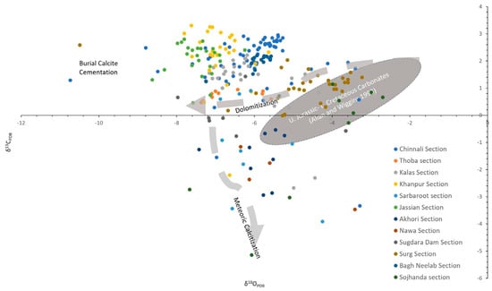 The stable isotopes, δ13C and δ18O, also show significant variation between the sections. The δ13C values range from −6.069‰ PDB in Thoba to 1.142 in Sojhanda, while the δ18O values range from −7.664‰ PDB in Sojhanda to −1.346‰ PDB in Surg (Figure 10). The mean value of δ13C in the Jassian section (−5.09‰ PDB) is lower than the overall mean, while the mean value of δ18O in the Surg section (−7.57‰ PDB) is noticeably lower than the overall mean.