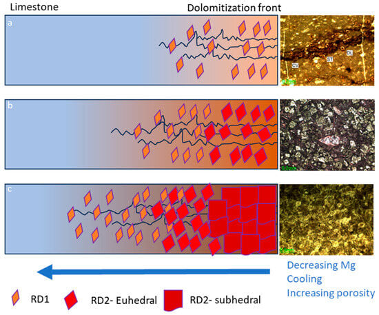 Systematic diagram showing evolution of the dolomitization front with time. (a) Initiation of the dolomitization front with RD1. (b) With the continued Mg influx and advancement of the front, this recrystallizes RD1 to euhedral RD2. (c) With further advancement, euhedral RD2 is recrystallized into subhedral RD2. Note how the fabric of the rock evolved along the length of the front with deleting and cooling fluid. Modified after [].