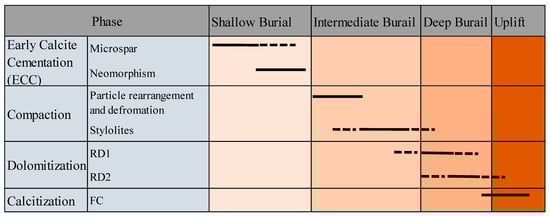 Paragenetic history of the Kawagarh Formation showing the sequence of key diagenetic phases along with the time of formation.
