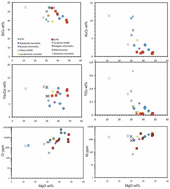 Variation diagram of MgO versus Al2O3, SiO2, Cr, Ni, TiO2, O, and Fe2O3t in Sukinda ultramafic complex and different high-Mg rocks (i.e., boninites, siliceous high-Mg basalts, and komatiites) in the world. The data are obtained after OMG boninite [46], Nuasahi boninite [9], Bababudan komatiite [47], Veligallu ultramafic [48], Sonakhan SHMB [49], Barberton komatiite [50], Pilbara SHMB [51], and Isua boninite cumulate [52].
