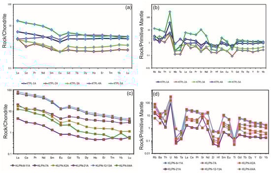 Chondrite-normalized rare-earth element patterns and primitive mantle-normalized multi-element plots of Sukinda ultramafic rocks. (a,b) Plotted for Kaliapani and (c,d) Katpal samples. For normalization, chondrite and primitive mantle values are taken from McDonough et al. (1995) [45].