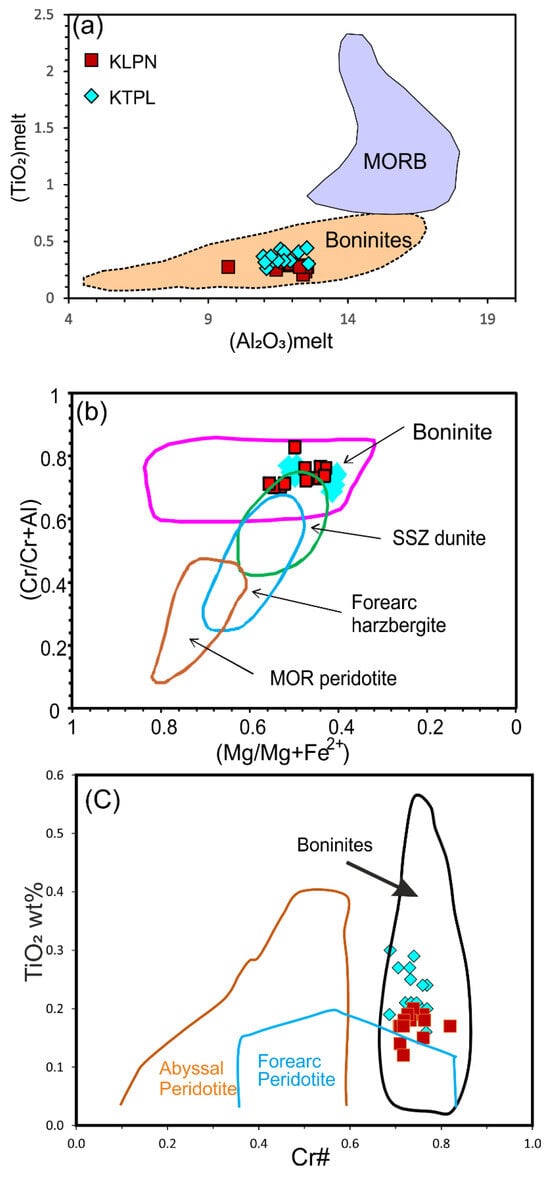 We compared primitive melts from different tectonic settings and Archean–Paleoproterozoic mafic–ultramafic magmas from Peninsular India presented with Sukinda boninitic rocks based on Al2O3 and TiO2 melt contents by the chromite mineral chemistry data (Table S3).