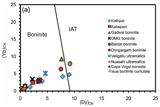 Sukinda ultramafic rocks are primarily composed of dunites, partially serpentinized dunites, and pyroxenites. During the ultramafic rocks’ residence and evolution process, Na2O, K2O, and large ion lithophile elements (LILs) (K, Sr, Cs, Rb, Ba) were possibly mobilized and did not reflect their initial distributions. Hence, high-field-strength elements (HFSEs) (Ti, Zr, Y, Nb, Ta, Hf, Th), REEs, and transitional elements (Cr, Ni, Cs, V) are used to classify the Sukinda ultramafic rocks. On the (Yb)CN vs. (Dy)CN diagram (Figure 7a), the samples occupy the field of boninites; one sample falls within the transition of boninite and island arc tholeiite (IAT) field. The samples from the Sukinda ultramafic complex with low V vs. Ti/1000 contents clustered in the “boninite” field (Figure 7b).