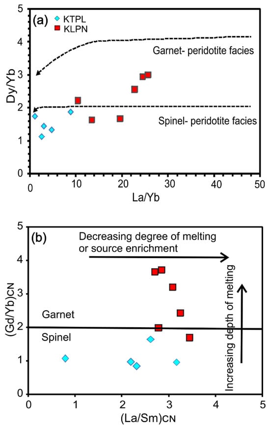 In the primitive mantle-normalized trace-element plots (normalization values were obtained from McDonough et al. (1995) [40] (Figure 5b), the incompatible elements of Katpal rocks displayed a negative correlation ([Th/Yb]PM = 2.73 to 6.93) ([Th/Eu]PM = 3.96 to 11.21), and the compatible elements displayed a relatively positive to flat pattern ([Eu/Yb]PM = 0.47 to 1.20). The primitive mantle-normalized trace-element plot displayed significant negative anomalies for several elements, including Nb ([Nb/Nb*] = 0.03 to 0.49), Ta ([Ta/Ta*] = 0.04 to 0.35, except for one sample that showed 1.17), Zr ([Zr/Zr*] = 0.10 to 0.70, except for one sample, KTPL-3A, which showed 1.41), Hf ([Hf/Hf*] = 0.08 to 0.60, except for one sample, KTPL-3A, which showed 1.26), and Ti ([Ti/Ti*] = 0.16 to 0.71, except for one sample, KTPL-3A, which showed 1.49). These negative anomalies indicated depletions in these elements relative to the primitive mantle.