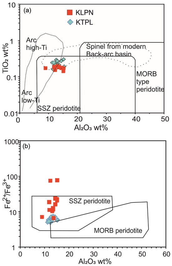 Various authors [68,74,76,77] have established a link between chromite’s Al2O3 and TiO2 contents and the composition of the surrounding melt. Ref. [77] proposed the idea that Al2O3 and TiO2 contents within chromite remain unaltered, even in the presence of subsolidus re-equilibration with olivine or post-cumulus reactions. As a result, these particular components can be relied upon as consistent indicators for deciphering the geochemical composition of the melt from which the chromite originally crystallized. Ref. [68] pointed out this relationship by studying chromite–olivine and melt inclusion–chromite pairs in oceanic arc and intraplate tectonic settings. The study revealed that the Al2O3 and TiO2 components could be effectively utilized to determine the tectonic setting in which the chromite formed.