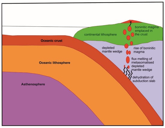 The generation of boninitic magmatism has been examined by different experimental studies and trace-element modeling. The primary components of boninite magmatism are a high hydroxyl content, higher mantle temperature, and mantle decompression [89,123,126,127]. According to [94,128,129,130], boninitic magma generation is achieved through a high degree of partial melting, which is metasomatized by slab-derived fluids/melts in a subduction zone at high temperatures (1130–1275 °C) and shallow depths (0.3–1.7 GPa).
