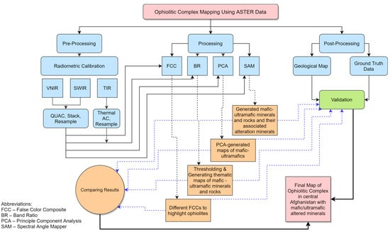 This study was meticulously assembled through an extensive remote sensing analysis, complemented by subsequent fieldwork to validate the obtained results. A diverse array of academic resources, including journal articles, conference proceedings, books, published geological reports, maps, and authoritative official websites, were diligently reviewed to conduct an in-depth literature review and thorough background research. As depicted in (Figure 3), the remote sensing studies in this work encompass pre-processing, processing, and post-processing stages. The utilization of Advanced Spaceborne Thermal Emission and Reflection Radiometer (ASTER) data facilitated the mapping of ophiolitic complexes along with their associated alteration minerals and rocks. The raw data underwent a preprocessing stage for radiometric calibration and atmospheric corrections prior to object extraction. Finally, the extracted objects underwent post-processing for validation as well as to elucidate their geological and tectonic implications.