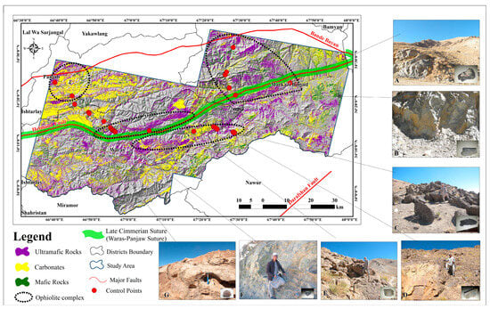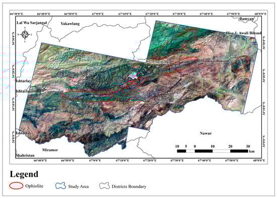 - Yousufi, A.; Ahmadi, H.; Bekbotayeva, A.; Arshamov, Y.; Baisalova, A.; Omarova, G.; Pekkan, E. Integration of Remote Sensing and Field Data in Ophiolite Investigations: A Case Study of Logar Ophiolite Complex, SE Afghanistan. Minerals 2023, 13, 234. [Google Scholar] [CrossRef]