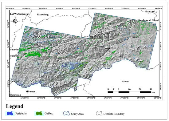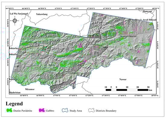 The identified formations are in line with the outcomes of false color composites (FCCs), exhibiting a high degree of consistency. Notably, the distribution of mafic-ultramafic bodies spans across various sectors of this study area. Predominantly, dunite peridotites are prevalent in the northern and central sections of the Waras district, as well as extending across the western and central zones of the Markazi Behsud district (Figure 8). Additionally, smaller gabbroid rock formations are observable, coming into contact with dunite peridotites in the northeastern segments of the Waras district, as well as across the eastern and central parts of the Markazi Behsud district. The presence of peridotite bodies is also noted across these regions, with a notable concentration in the southern regions of the Panjab district (refer to Figure 8 for visualization).