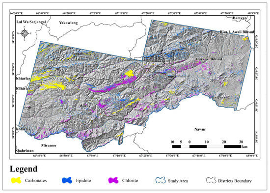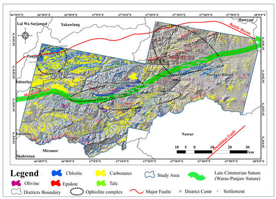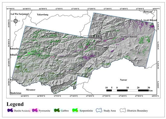 Typically, mafic-ultramafic bodies are commonly followed by carbonate formations. To identify these carbonate minerals and other related mafic-ultramafic alteration minerals, we employed various band ratios. The band ratios 4/8, derived from the works of [3,16], were utilized to identify carbonate minerals. Additionally, a self-proposed ratio of 5/1 was applied for the epidote, and a 5/3 band ratio (also self-proposed) was employed for chlorite minerals. These ratios were assessed using ASTER data across this study area (refer to Figure 9). Presenting the results of each individual band ratio could potentially overwhelm readers with information, as it might make it challenging to highlight all the minerals within this study area. To address this, a comprehensive approach was taken: the outcomes from both the literature-based and self-proposed band ratios were amalgamated into a single map with different colors. This map was then superimposed with a hillshade representation of this study area, enhancing the visual clarity for readers’ benefit (see Figure 9). As evident from (Figure 9), the spatial arrangement of epidote and chlorite aligns seamlessly with the identified ophiolitic complexes through alternative methods. Both minerals are distributed (NE-SW), which is corroborated by the FCC results. Their substantial presence is notably observed to the east of Markazi Behsud, as well as across the central and southern regions of the Waras districts. Furthermore, the geospatial distribution of carbonates is notably conspicuous to the west of Waras and in the southwest of Panjab districts. These areas directly interface with the ophiolitic complexes in the field (Figure 9).
